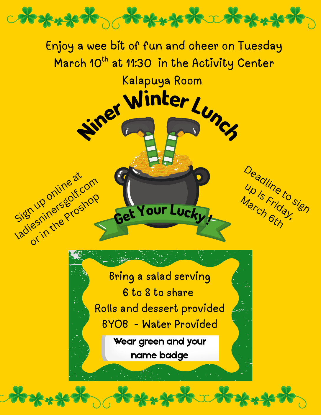 The last of the Niner Winter events will be a St. Patrick's Day inspired lunch. Please join us on Tuesday, March 10th at 11:30 AM in the Kalapuya/Hazelglade room of the Activity Center. Bring a salad that serves 6 to 8 people to share, BYOB. Rolls , dessert and water will be provided. There is
