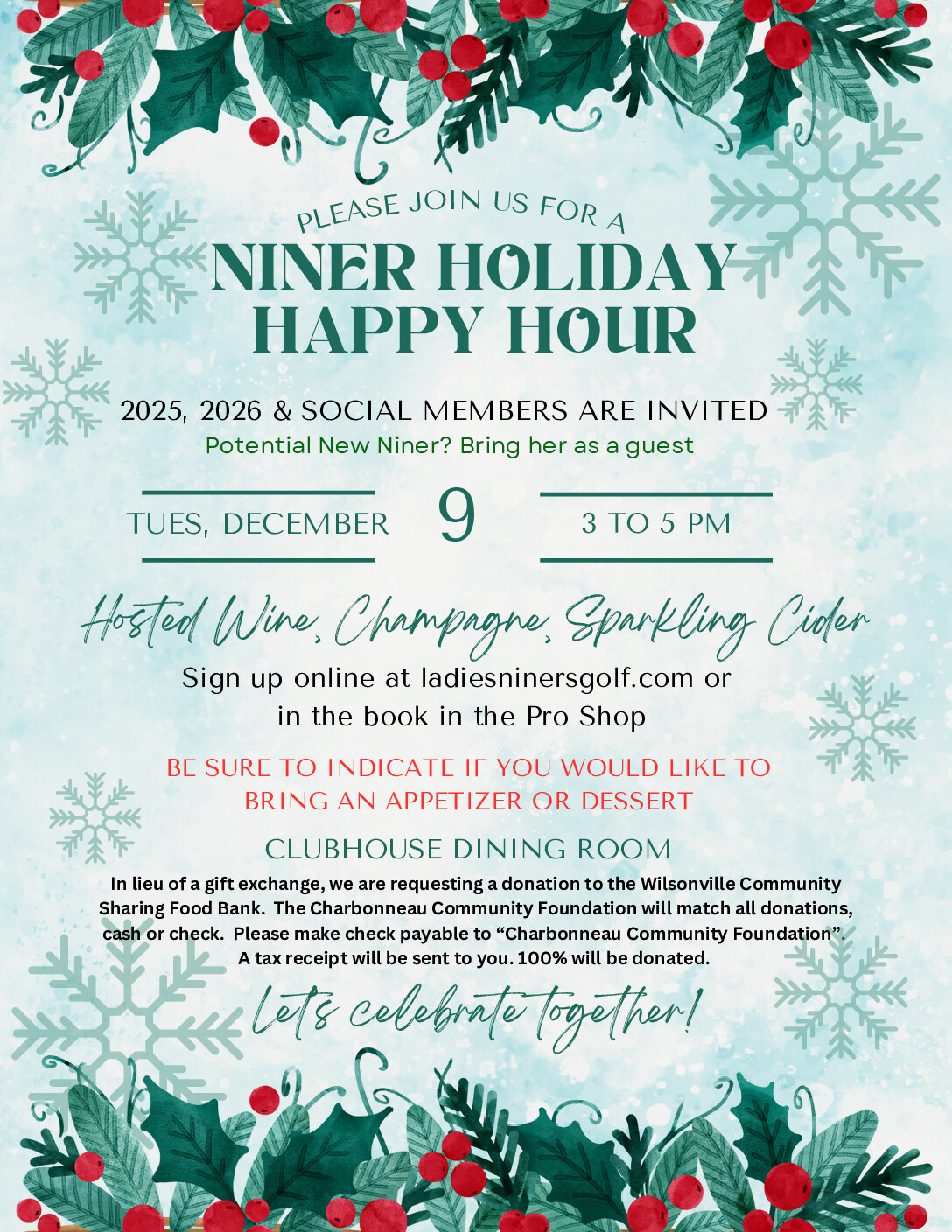 Please join the Niners for a fun-filled afternoon on December 9th, 3 PM to 5 PM in the clubhouse dining room. 2025, 2026 and Social members are invited. Hosted beverages. Bring a dessert or appetizer. Sign up online at ladiesninersgolf.com or in the book in the ProShop