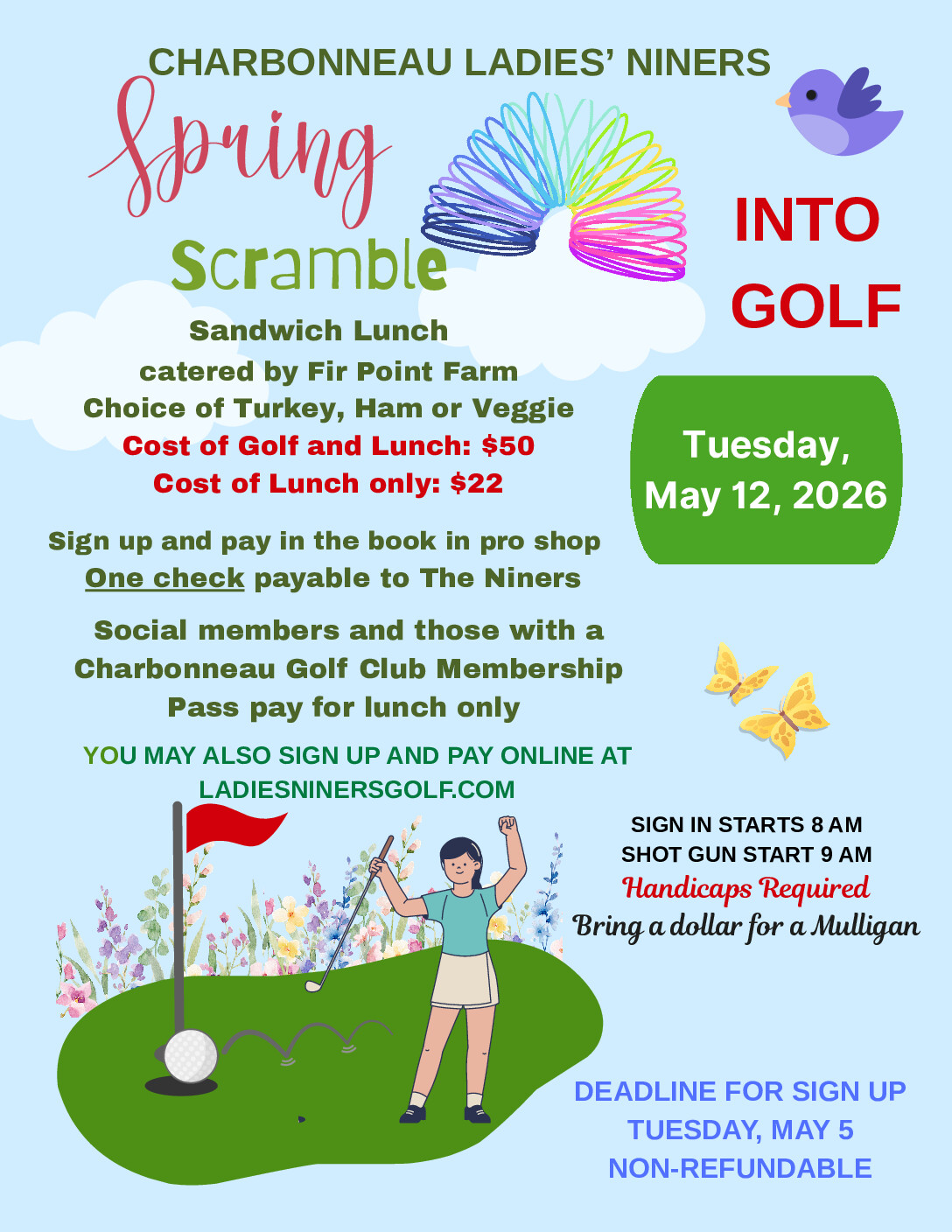Sign Up open online and in book in Pro Shop for Niners' May 12 Scramble. Box lunch supplied by Fir Point Farms.